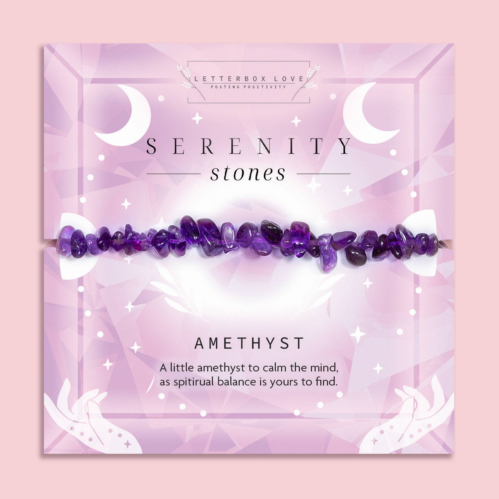 A little amethyst to calm the mind, as spiritual balance is yours to find. Embrace calm and clarity with this powerful crystal bracelet from our Serenity Stones collection. Made with real purple Amethyst crystal chips, each piece is elasticated for a comfortable fit and comes with its own uplifting affirmation.