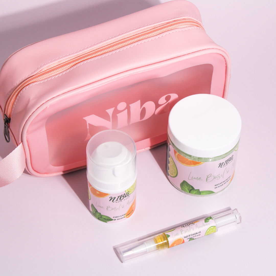 Lime, Basil & Mandarin set: 1 x Lime, Basil & Mandarin Sugar Scrub, 1 x Lime, Basil & Mandarin hand and body cream & 1 x Lime, Basil & Mandarin Nail & Cuticle Oil 4ml pen and our toiletry bag.