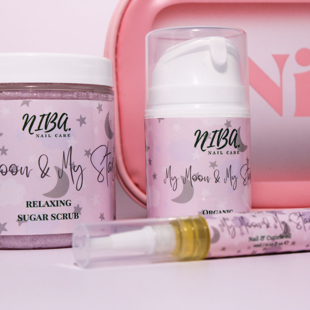 The Dreamy Set: 1x My Moon & My Stars Sugar Scrub, 1x My Moon & My Stars Nail & Cuticle Oil 4ml pen, 1x My Moon & My Stars Hand & Body Cream and our toiletry bag.